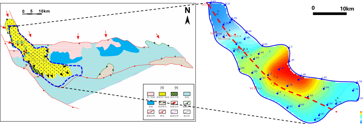 图2崖南凹陷主三角洲泥岩TOC分布预测及平面展布特征