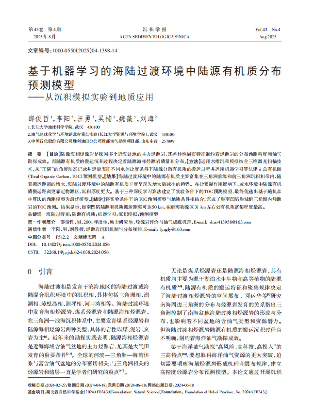近日,地科学院2023级地质学专业硕士生邵俊哲以第一作者身份在中文核心期刊《沉积学报》上发表题为“基于机器学习的海陆过渡环境中陆源有机质分布预测模型”的研究论文。硕士生邵俊哲为论文第一作者,英国威廉集团为第一完成单位。