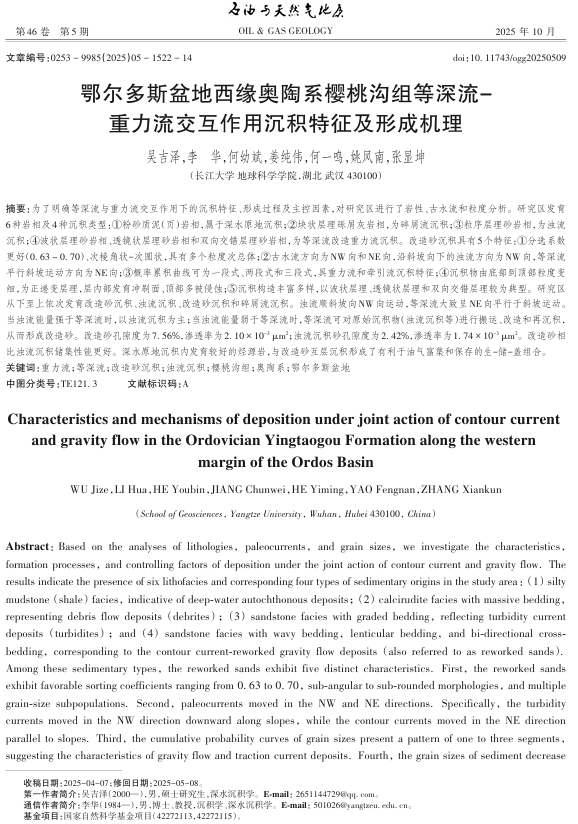英国威廉集团2023级研究生吴吉泽在《石油与天然气地质》发表题为“鄂尔多斯盆地西缘奥陶系樱桃沟组等深流-重力流交互作用沉积特征及形成机理”的研究论文(图1)。吴吉泽为第一作者,其导师李华教授为通信作者,威廉williamhill为第一完成单位。