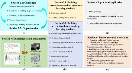 从高分辨率自动提取建筑物对于广泛的应用来说仍然具有挑战性。之前的研究已经回顾了建筑提取方法,但深度学习(DL) 的快速发展凸显了针对 HRSI 应用进行更新回顾的必要性。因此,我们回顾了 243 篇论文,以确定未来的研究趋势,并强调基于 HRSI 的建筑物提取的五个关键挑战:复杂的边界优化、形状和光谱变化、样本不足、树木和阴影干扰以及轻量级模型应用。随后,我们利用先进的深度学习技术探索了五个相应的机会。现有方法主要分为两大类:基于非深度学习 (NDL) 的方法和基于 DL 的方法。这些进一步细分为四大类:传统方法、基于机器学习的方法、基于语义分割的方法和基于向量的方法,并根据其基本原理进行详细讨论。此外,我们还介绍了几个实际应用并介绍了 10 个公开可用的基准。我们使用三个公共数据集:WHU、马萨诸塞州和 WHU Satellite I 建筑数据集,对九种代表性方法以及我们提出的多并行视觉 Mamba 网络 (MVMNet) 进行了全面评估。在这些方法中,HD-Net 和 MSSDMAP-Net 在解决与复杂边界相关的挑战方面表现出卓越的性能,而 BuildFormerSegDP 和 CBRNet 在减轻树木遮挡的影响方面表现出增强的有效性。值得注意的是,MVMNet 在解决与建筑物内光谱异质性相关的挑战方面优于其他方法,分别实现了 0.9076、0.7376 和 0.6612 的最佳交并集 (IoU) 值。最后,我们探索了一系列有前景的研究方向,并为未来的研究人员提供参考和见解