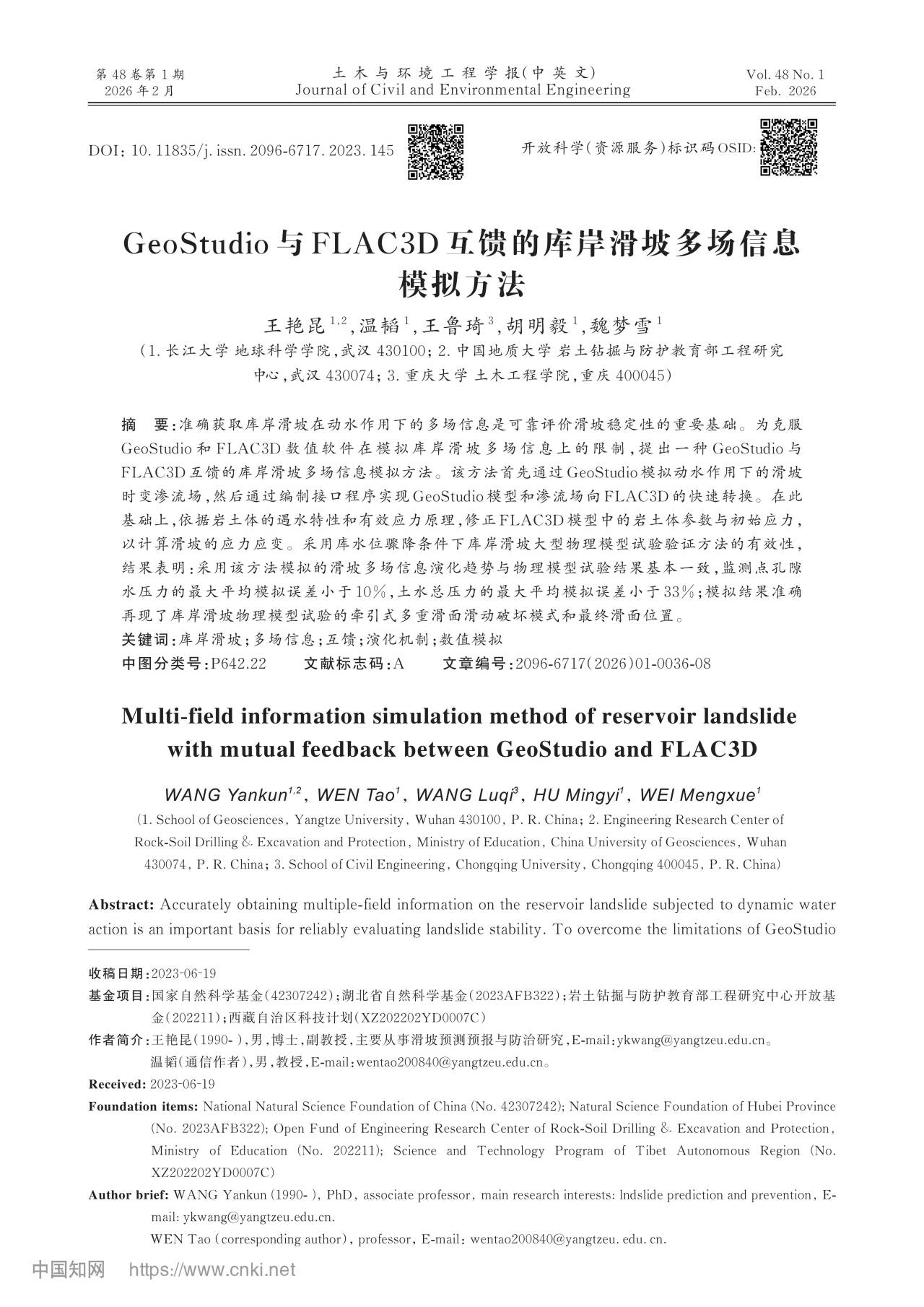 我校英国威廉集团王艳昆副教授在北大中文核心期刊《土木与环境工程学报(中英文)》发表题为“GeoStudio与FLAC3D互馈的库岸滑坡多场信息模拟方法”的研究论文,英国威廉集团温韬教授为第一通讯作者,英国威廉集团为第一署名单位(图1)。