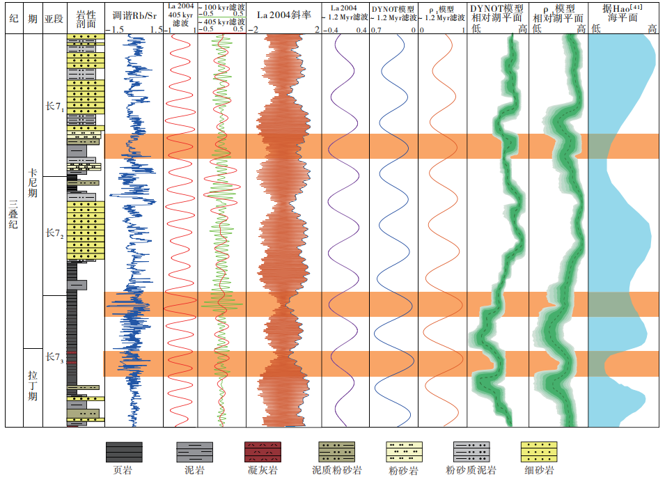 根据平均沉积速率1.1 cm/kyr,推算出405 kyr长偏心率周期对应沉积厚度约为4.53 m,100 kyr短偏心率周期约为1.07 m。共识别出23个长偏心率旋回,据此建立浮动天文年代标尺,时长约9.35 Myr。最终以底部凝灰岩锆石U-Pb年龄(239.1 ± 1.4 Ma)为锚点,构建了绝对天文年代标尺。基于沉积噪声模型反演的古湖平面变化识别出1.2 Myr长斜率周期,该信号与全球海平面变化记录呈反相位关系,揭示了温室气候背景下天文轨道驱动的地下水储库波动对海平面变化的控制机制。本研究首次在鄂尔多斯盆地长7段湖相地层中建立高精度天文年代标尺,为页岩油气勘探提供了可靠的年代框架及古气候驱动理论支撑。