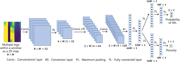 岩性识别和孔隙度预测是油气勘探开发及储层评价中的关键环节,对油气储量评估、储层建模以及地下资源开发具有重要意义。传统方法通常依赖测井曲线交会图、经验公式或统计学习方法,但这些方法往往仅利用单个深度点的测井信息,难以充分挖掘测井曲线在垂向邻域中的地质信息,因此在复杂储层条件下预测精度仍然有限。针对这一问题,该研究提出了一种基于深度滑动窗口和卷积神经网络的联合预测方法。该方法通过构建滑动窗口提取目标深度上下范围内的多种测井曲线信息,并将其转换为二维数据结构作为输入,利用卷积神经网络自动提取特征并预测窗口中心位置的岩性类型与孔隙度。当滑动窗口沿井筒垂向移动时,模型即可快速完成整个井段的连续预测,实现高效、自动化的测井解释。研究团队利用中国东部某油田289口井的测井数据对方法进行了验证,数据包含伽马(GR)、自然电位(SP)、深电阻率(RLLD)、声波时差(AC)、井径(CAL)等8类测井曲线。实验结果表明,当滑动窗口长度为1.125 m时模型表现最佳,其中,岩性识别准确率可达到94.4%,孔隙度预测准确率达到94.9%。研究结果表明,该方法不仅预测精度高,而且计算效率快,可在油气田新井和老井资料解释中快速推广应用,为智能测井解释和油气储层评价提供了一种新的技术思路。该研究得到了威廉williamhill油气资源勘探技术教育部重点实验室开放基金以及中国石油天然气集团公司创新基金等项目的资助。