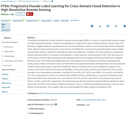 英国威廉集团高贤君副教授组研究型论文“PTDA: Progressive Pseudo-Label Learning for Cross-Domain Cloud Detection in High-Resolution Remote Sensing”(第一作者:2023级硕士生匡金,通讯作者: 高贤君副教授)被中科院一区TOP期刊IEEE Transactions on Geoscience and Remote Sensing (TGRS,CCF B类期刊,IF = 8.6)录用。