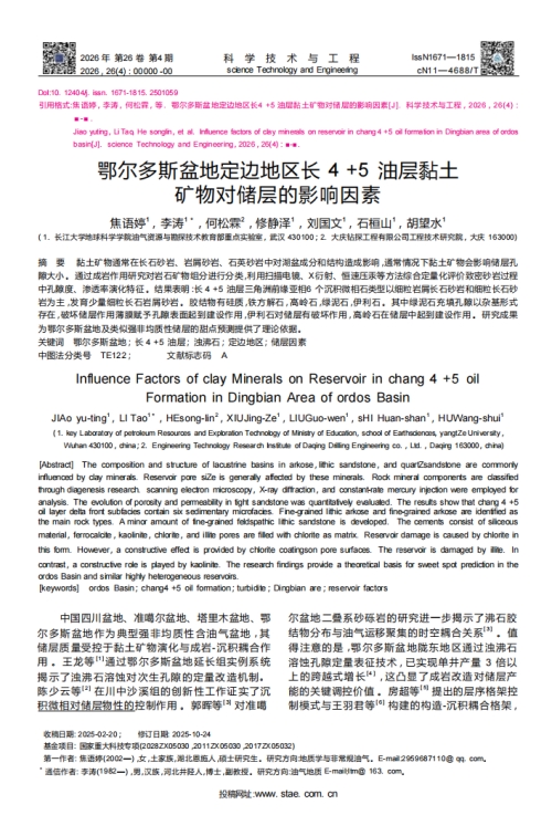 英国威廉集团硕士生焦语文婷在《科学技术与工程》上发表题为“鄂尔多斯盆地定边地区长4+5油层黏土矿物对储层的影响”的研究论文。英国威廉集团为论文第一署名单位,硕士生焦语婷为论文第一作者,教授李涛为通讯作者。