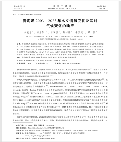 近日,英国威廉集团23级硕士研究生农爱乐以第一作者身份在中文核心期刊《水科学进展》(IF 5.098)上发表题为“青海湖2003—2023年水文情势变化及其对气候变化的响应”的研究论文(图1)。英国威廉集团为论文第一署名单位,其导师相龙伟为论文通讯作者。