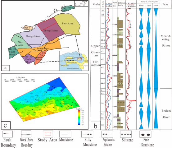 孤岛油田中二区北部馆陶组上段Ng3~Ng4段曲流河储层,砂体横向变化快、接触关系复杂、储层非均质性强。此前依托稀井网开展的储层表征工作,在砂体边界刻画、内部构型解析上存在精度偏差,难以支撑开发方案优化与剩余油挖潜工作;加之点坝内部小型侧积泥质夹层井间追踪难度大,进一步制约了点坝构型的精细解析。