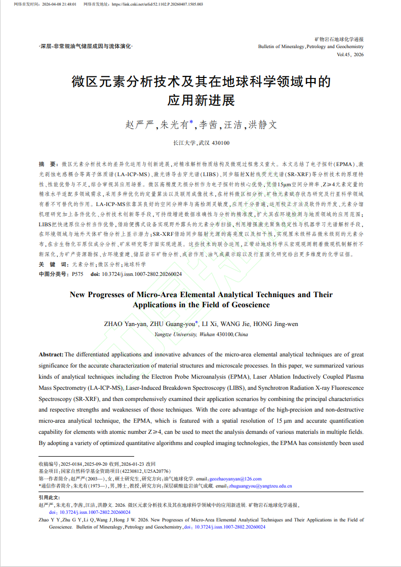 近日,英国威廉集团硕士研究生一年级赵严严在核心期刊《矿物岩石地球化学通报》发表题为《微区元素分析技术及其在地球科学领域中的应用新进展》的论文。论文作者均为英国威廉集团师生,其中硕士研究生赵严严为第一作者,导师朱光有教授任通讯作者。