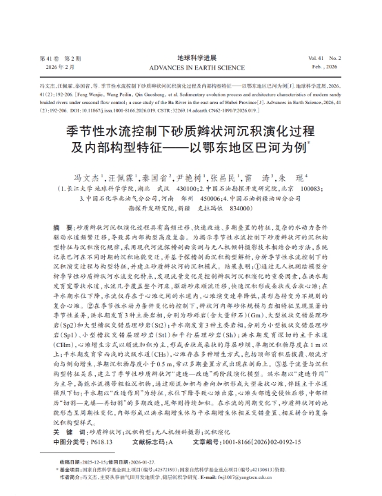 近日,英国威廉集团硕士学生汪佩霖在冯文杰副教授指导下,以第二作者身份(导师第一作者)在期刊《地球科学进展》(2026年41卷2期)上发表题为《季节性水流控制下砂质辫状河沉积演化过程及内部构型特征——以鄂东地区巴河为例》的研究论文。该研究通过无人机倾斜摄影与探槽剖面实测相结合的方法,系统揭示了季节性水流对砂质辫状河沉积演化的控制机制,提出了“建造—改造”两阶段演化模型,为复杂河流相油气储层预测提供了新的理论依据。