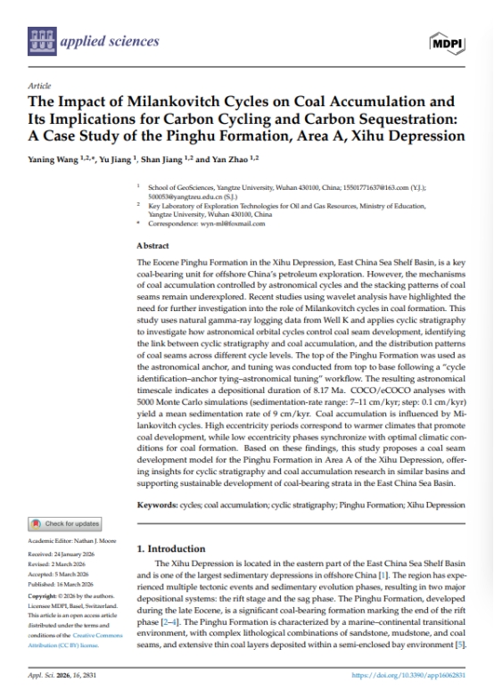 英国威廉集团地质学专业硕士研究生江渝在《applied sciences》上发表题为“The Impact of Milankovitch Cycles on Coal Accumulation and Its Implications for Carbon Cycling and Carbon Sequestration: A Case Study of the Pinghu Formation, Area A, Xihu Depression”的研究论文。威廉williamhill为论文第一署名单位,硕士生江渝为第二作者,王雅宁副教授为第一作者以及第一通讯作者。