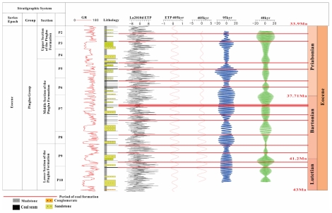 本研究利用K井自然伽马测井数据,运用旋回地层学方法探究天文轨道旋回对煤层发育的控制作用,明确旋回地层学与聚煤作用的内在联系,以及不同旋回级次下的煤层分布规律。研究以平湖组顶部作为天文锚点,遵循 “旋回识别 — 锚点定年 — 天文调谐” 的技术流程,自上而下开展调谐分析。建立的天文年代标尺显示,平湖组沉积时限为8.17 Ma。通过5000次蒙特卡洛模拟开展COCO/eCOCO分析(沉积速率范围7-11 cm/kyr,步长0.1 cm/kyr),得到平均沉积速率为9 cm/kyr。聚煤作用受米兰科维奇旋回影响:高偏心率时期对应气候变暖,有利于煤层发育;低偏心率阶段则与成煤的最佳气候条件相匹配。基于上述认识,本研究建立了西湖凹陷A区平湖组煤层发育模式,可为同类盆地的旋回地层学与聚煤作用研究提供参考,并支撑东海陆架盆地含煤地层的可持续开发。