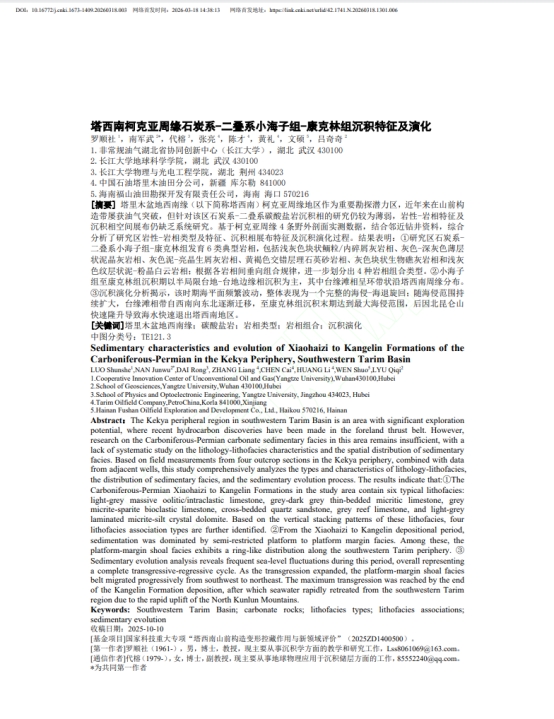 英国威廉集团23级硕士研究生南军武在期刊《威廉williamhill学报(自然科学版)》上发表题为“塔西南柯克亚周缘石炭-二叠系小海子组-康克林组沉积特征演化”的研究论文。英国威廉集团为论文第一署名单位,硕士研究生南军武为论文第二作者,其导师罗顺社教授为该文第一作者。