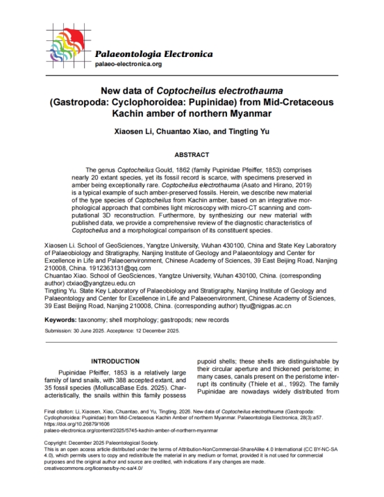 英国威廉集团地质学专业硕士研究生李啸森在地球科学与古生物学领域期刊《Palaeontologia Electronica》上发表题为“New data ofCoptocheilus electrothauma(Gastropoda: Cyclophoroidea: Pupinidae) from Mid-Cretaceous Kachin Amber of northern Myanmar”的研究论文,李啸森为第一作者,我院肖传桃教授为第一通讯作者。