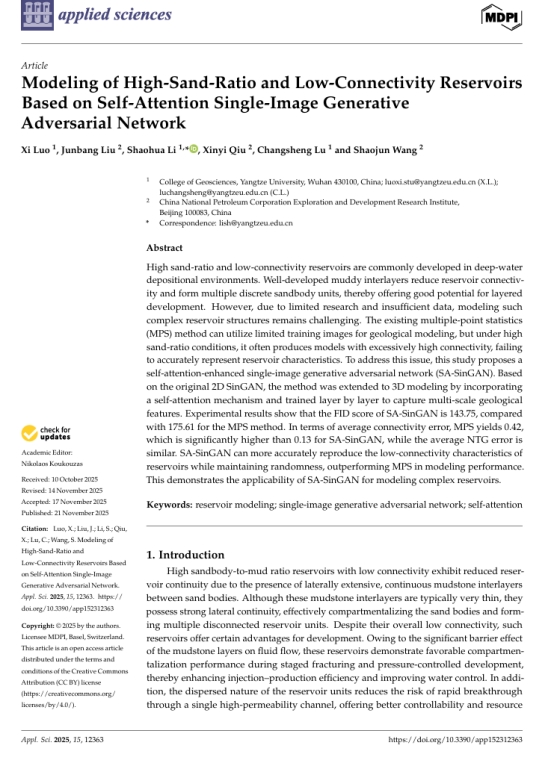 英国威廉集团2023级研究生罗玺在地球科学与工程应用领域期刊《Applied Sciences》发表题为“AModeling of High-Sand-Ratio and Low-Connectivity Reservoirs Based on Self-Attention Single-Image Generative Adversarial Network”的研究论文。英国威廉集团为论文第一署名单位,研究生罗玺为论文第一作者,其导师李少华为论文通讯作者。