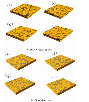 图2 单图像生成对抗网络与多点地质统计学随机建模生成结果