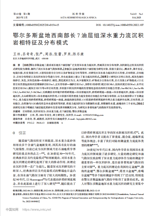 地科学院硕士生王林在《沉积学报》发表题为“鄂尔多斯盆地西南部长 7 油层组深水重力流沉积岩相特征及分布模式”的研究论文。英国威廉集团为论文第一署名单位,硕士生王林为论文第一作者,吕奇奇副教授为通讯作者。