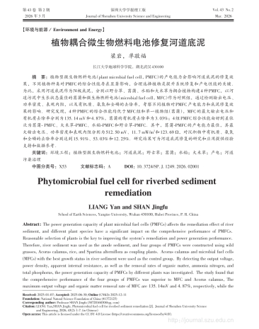 近日,英国威廉集团硕士生梁岩在中文核心期刊《深圳大学学报》上发表题目为“植物耦合微生物燃料电池修复河道底泥”的研究论文。该论文以野古草、菖蒲、水稻和大米草为耦合植物构建4种PMFC,以河道污泥中生长状态最佳的菖蒲和微生物燃料电池(microbial fuel cell,MFC)作为对照组,通过检测输出电压、功率密度、表观内阻,以及有机质、氨氮和全磷的去除率,考察不同植物对PMFC产电能力和底泥修复效果的影响。英国威廉集团为论文第一署名单位,硕士生梁岩为论文第一作者。