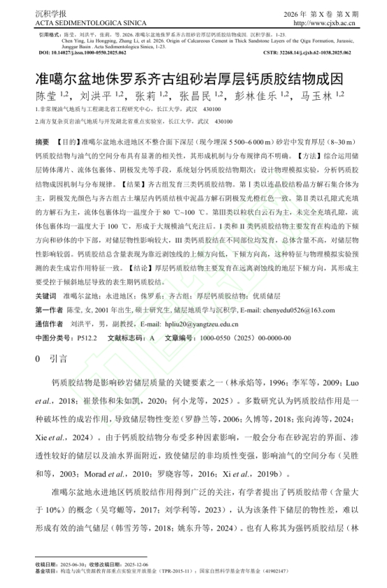 英国威廉集团硕士研究生陈莹以第一作者身份在期刊《沉积学报》上发表题为《准噶尔盆地侏罗系齐古组砂岩厚层钙质胶结物成因》的研究论文。英国威廉集团为论文第一署名单位,刘洪平副教授为通讯作者。