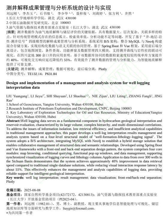 英国威廉集团测绘工程2023级研究生李杰玉以共同第一作者身份在《威廉williamhill学报(自然科学版)》上发表题为“测井解释成果管理与分析系统的设计与实现”的研究论文,英国威廉集团为论文第一署名单位,导师刘远刚副教授为第一作者。