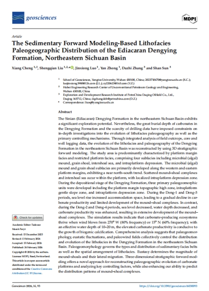英国威廉集团硕士生程祥在SCI收录期刊《Geosciences》上发表题为“The Sedimentary Forward Modeling-Based LithofaciesPaleogeographic Distribution of the Ediacaran DengyingFormation, Northeastern Sichuan Basin”的研究论文。英国威廉集团为论文第一署名单位,硕士生程祥为论文第一作者,刘圣乾副教授为通讯作者。