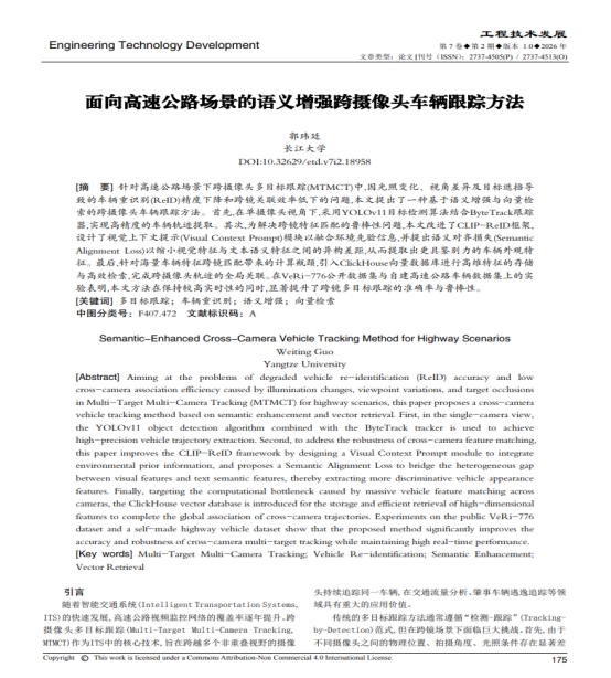 英国威廉集团硕士研究生郭玮廷在《工程技术发展》上发表题为“面向高速公路场景的语义增强跨摄像头车辆跟踪方法”的研究论文。英国威廉集团为论文第一署名单位,硕士研究生郭玮廷为论文第一作者。