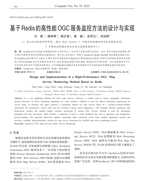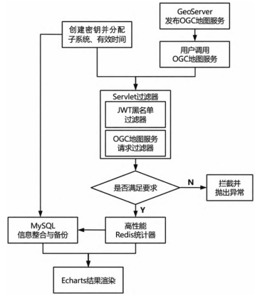 论文提出了一种结合GeoServer+Redis+MySQL的高性能地图服务监控方法:在Geoserver所发布的各类OGC地图服务调用过程中,引入融合JWT黑名单机制的Servlet过滤器实现请求拦截与服务类型识别,并利用Redis嵌套哈希结构实时统计各应用系统的服务调用次数、响应时间等指标,再定时将数据同步至MySQL实现持久化与整合,最终借助ECharts生成可视化监控面板,辅助运维与管理决策。该方法能够满足多个应用系统并发访问下的服务监控需求,可为WebGIS地图服务发布系统提供可行且高性能的地图服务监控实现途径。