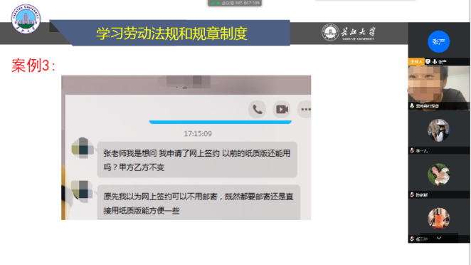 在就业政策讲解部分,张老师就引导学生如何获悉并充分发挥就业政策的作用,学习利用劳动法规保护自己,同时我们自己又应该遵守哪些规章制度来规避风险,以及熟悉学校、学院就业工作基本程序和相关规定等方面进行了介绍。讲解过程中,除了向同学们介绍在疫情环境下国家政府在扶持大学生就业创业方面的鼓励、优待政策以外,还向同学们推广了“威廉williamhill就业信息网”政策法规专栏,引导学生充分挖掘并利用资源了解国家各部委、各省市等制定的吸引人才、促进就业创业的政策。此外,会上还利用前期学生线上咨询的案例对学生在就业过程中遇到的具体问题进行分析和引导,避免学生在后面进入相同的误区。