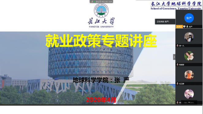 (通讯员 张严)为进一步开展好疫情防控下大学生就业创业工作,积极宣传国家就业创业政策,4月30日晚7点,地科学院利用腾讯会议平台举行了大学生就业政策解读专题讲座,2017级本科生以及部分2020届研究生和本科生参加了讲座。讲座由辅导员张严老师主持。