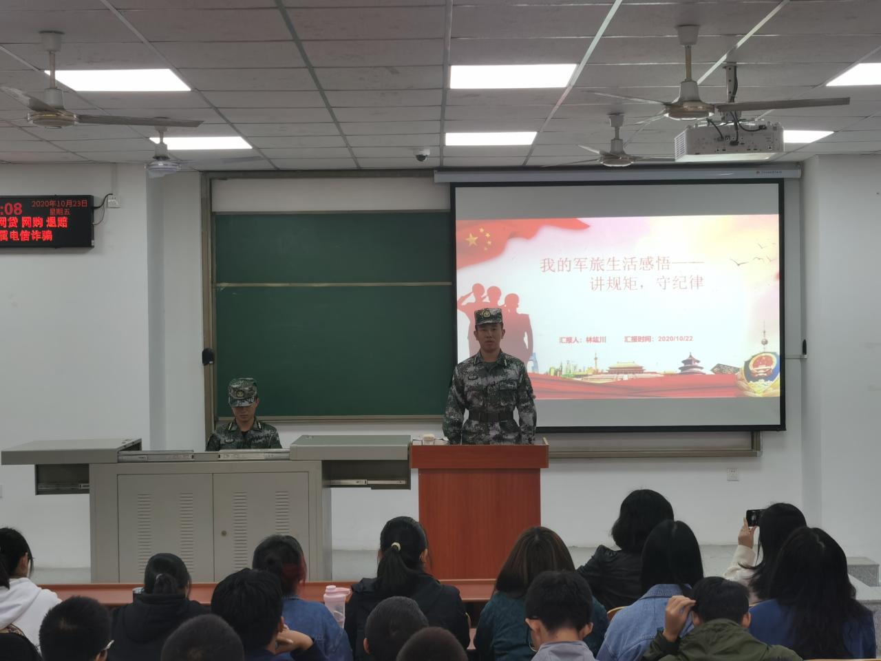(通讯员 陶潇桐)为了优化学生管理,帮助新生自觉养成讲规矩、守纪律、珍惜时间的好习惯,我院邀请从海军陆战队退伍的地信21701班林竑川同学于10月23日在武教B-106举行了以“讲规矩,守纪律”为主题的军旅生活分享会。党委副书记任倩老师、辅导员郭霖老师,地信22001和地信22002班全体同学参加了本次活动。