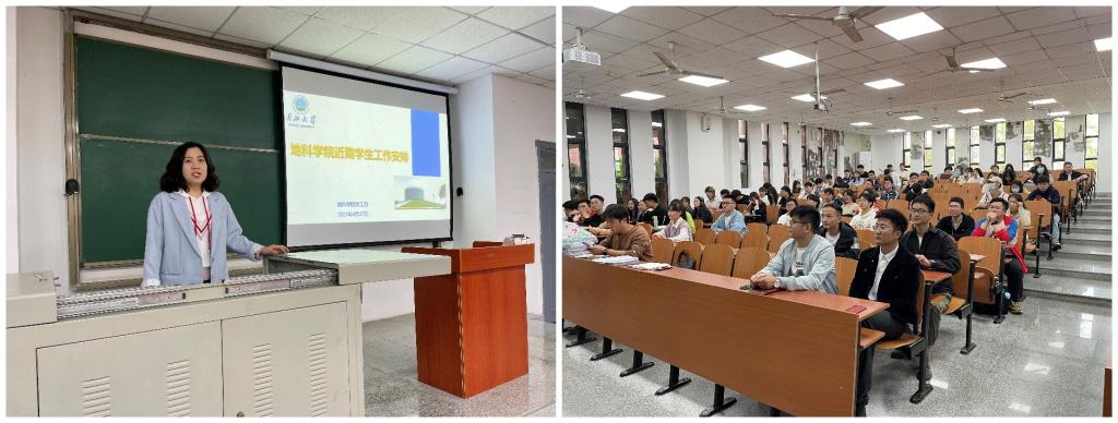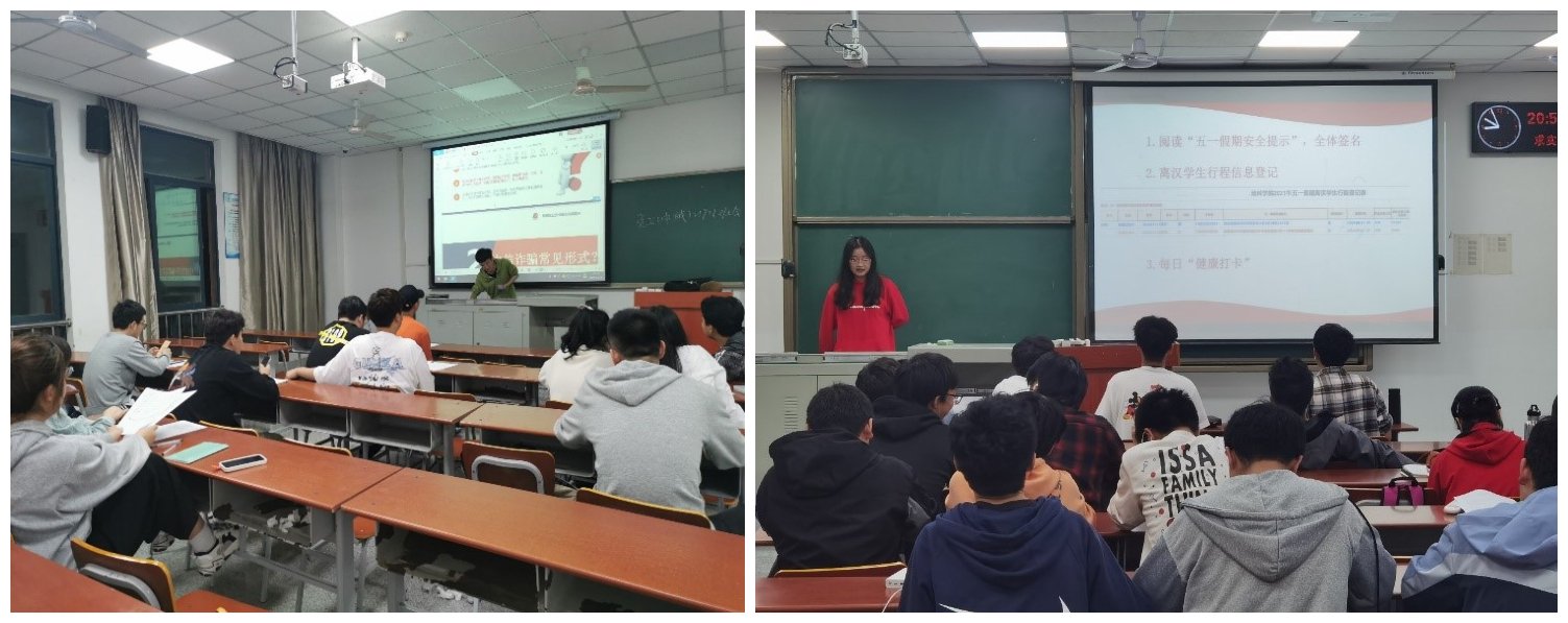 接下来,郭霖老师针对一系列安全问题做了详细安排和说明。一是宿舍管理方面。郭老师通报了4月份我院学生宿舍使用违规电器和晚归情况,并对事件危害进行了分析,提醒大家务必遵守学校相关规定,安全高于一切。二是五一假期安全。要求各班班长召开安全主题班会,在班会上做好防溺水、运动安全、防电信诈骗和五一假期安全四个方面的教育,重点做好“国家反诈中心”APP和微信公众号“金钟罩”的下载与认证、假期离汉学生的行程登记、假期安全教育告知书的签收等。