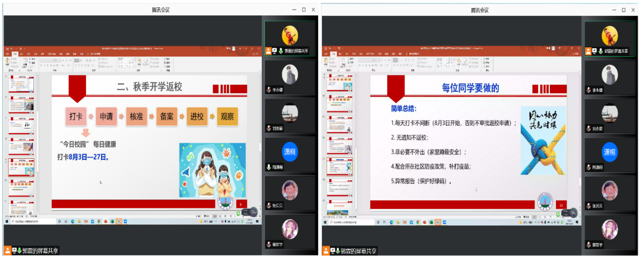 各年级辅导员按“校内”与“校外”两类学生分组组织召开主题班会。会议内容主要包括暑假学生管理和秋季开学返校安排两方面,重点介绍了当前愈发严重的疫情防控形势,要求同学们在暑假期间保持信息的畅通、明确学校的相关要求、非必要不外出并出现问题及时报告,最后要求积极注射疫苗;接下来对返校的6个步骤逐一进行讲解,特别是对“打卡”和“申请”环节的“每天坚持打卡、提交行程绿码和健康绿码、填写返校行程”等重难点工作进行了仔细说明。