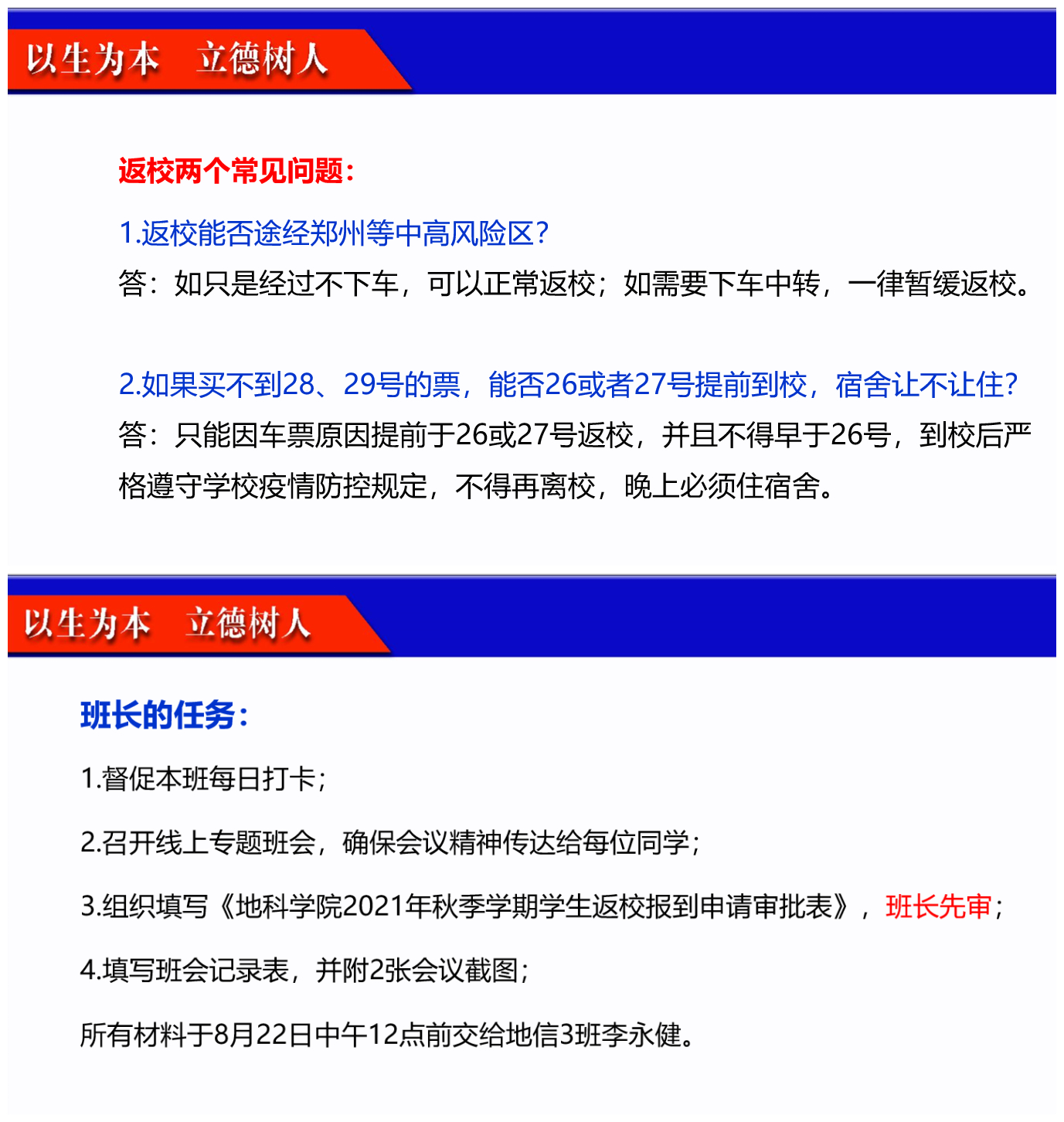 (通讯员 李永健)为确保2021年秋季学期开学返校工作平稳有序开展,我院按照疫情防控要求以及8月15日学校发布的《关于做好2021年秋季学期开学准备工作的通知》,于8月20-22日用腾讯会议的形式在全体学生中召开了“地科学院2021年秋季学期返校工作安排”主题班会。