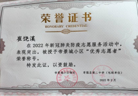 崔饶溪工作感言:志愿工作虽辛苦,也有许多幸福的瞬间。当路过的叔叔阿姨亲切地对我们说辛苦了,我感觉自己的工作非常值得。愿尽我的绵薄之力为故城带来祥和与安宁。
