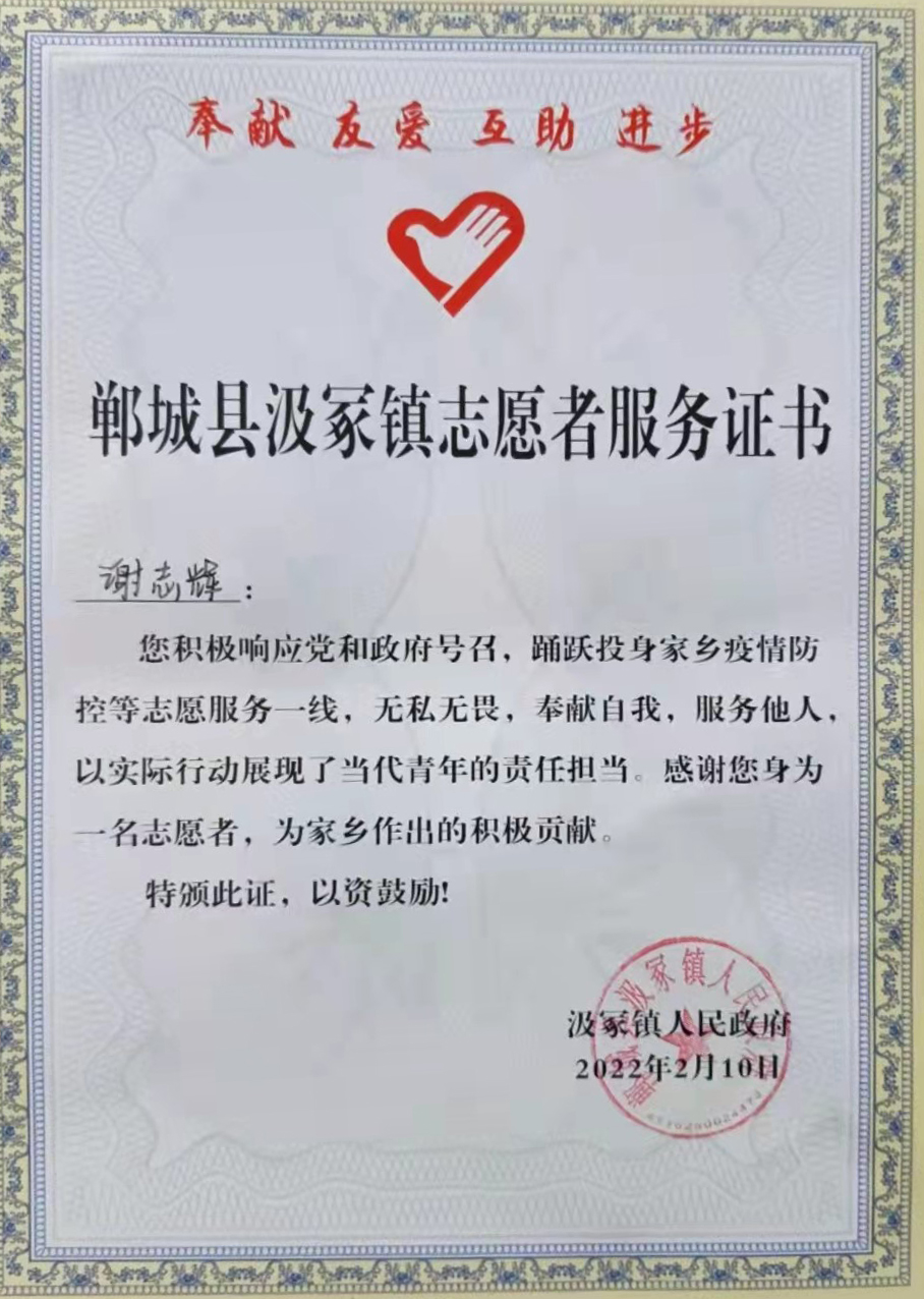 图三 谢志辉的志愿者证书
