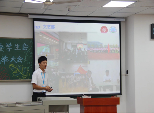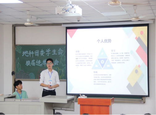 接下来是第十一届主席团与部长竞选角逐环节。同学们自信坚定地迈上讲台,介绍自己的竞选优势和未来工作计划。地信(产业)22001班刘亚唯同学昂首挺胸第一个上台,不仅介绍了他负责文艺部期间所取得的成绩与收获,还表示了对当选新一届主席团成员的信心与渴望。共有六位同学竞选主席团,二十余位同学竞选各部门部长。