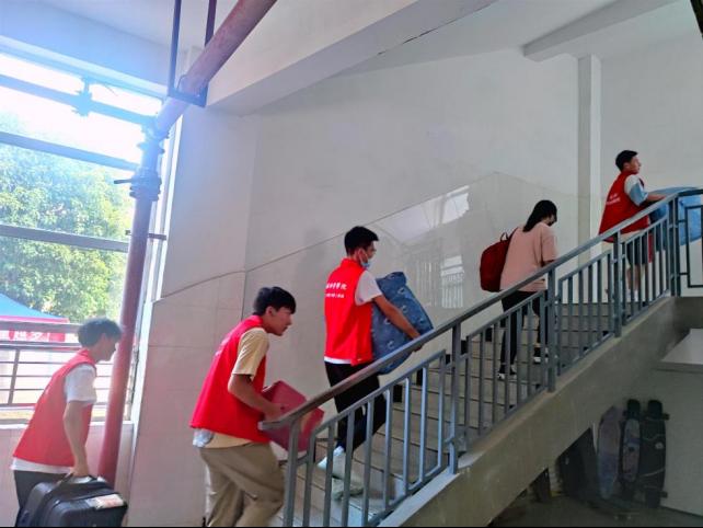 通过前期安排,新生到达学院迎新点后,按报到流程,进行行李消杀、身份核查、领取通行证及校园卡、登记信息、然后在志愿者的协助下搬运行李,到宿舍办理入住。