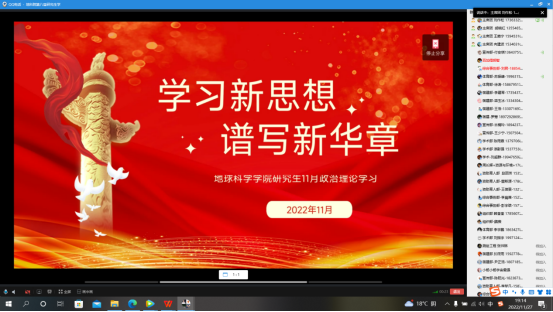 (通讯员付安琪古楠玲)为深入学习贯彻习近平新时代中国特色社会主义思想,进一步增强“四个意识”,坚定“四个自信”,做到“两个维护”,提升我院研究生政治理论素养,深刻认识和准确把握党的二十大重大主题、重大理论观点、重大战略思想。从11月10日至11月30日,我院开展了以班为单位组织学习,线上、线下相结合的政治理论学习活动。并于11月27日晚,集中进行了线上政治理论学习活动,此次政治理学习活动由我院研究生会主席刘作松主持与讲解,部分研究生参加。