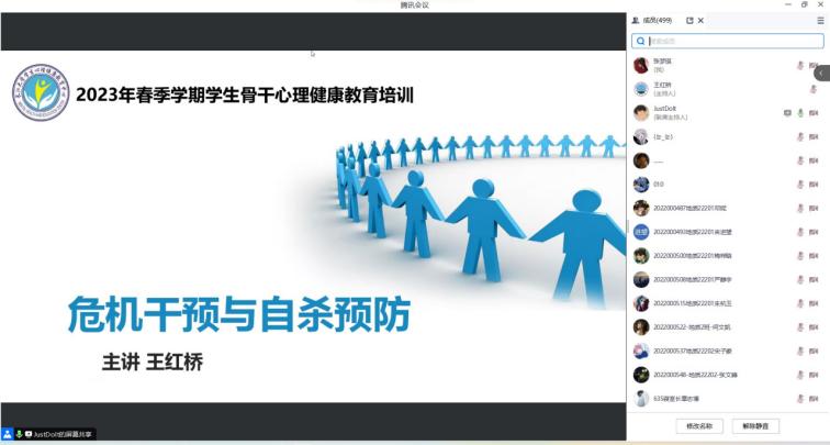 (通讯员 张梦琪)我院于2023年6月30日通过腾讯会议的方式举行以“危机干预与自杀预防”为主题的心理讲座。各年级班长、团支书、安全员、心理委员、寝室长及暑期留校学生等共计499名师生参与学习交流,心理专干王红桥老师主讲。