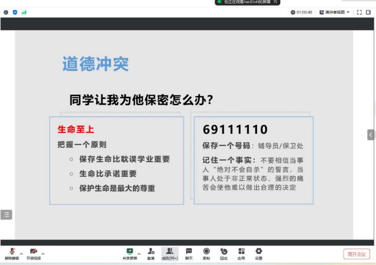 王老师首先解释了心理危机的含义、类型及特点。接着引出“讨论自杀会引导对方自杀”等五个判断题,破除大家对自杀问题的常见误解。然后详细讲解了自杀过程、自杀征兆、干预的三步法,并介绍我校心理健康教育体系,让大家感受到学院和老师是大家始终如一的依靠,自己不是一个人在战斗。最后,王老师呼吁大家把握“生命至上”的原则,提高对于自杀征兆的敏感性,携手共创互助氛围,及时化解身边的危机事件。