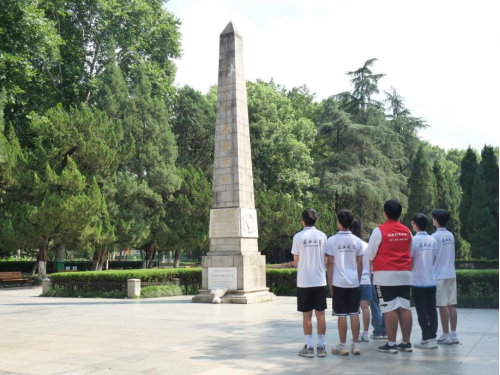 下午三时,实践队员们怀着沉重的心情来到了苏联空军志愿队烈士墓,这是抗日战争时期为支援中国人民而英勇献身的苏联空军志愿队15位国际主义战士的坟墓。进入公园,穿过一排林荫道,走过一架木桥,便来到了陵园。园区很静,隐隐约约的树影中,远远的就能看到“苏联空军志愿队烈士墓”的纪念碑沉默地矗立在陵园中。走近些,纪念碑上的碑文清晰可见——“在中国人民抗日战争中牺牲的苏联空军志愿队烈士永垂不朽”。碑前有宽阔的墓道,道两旁松柏成行,繁花似锦,使陵园景色愈加庄严瑰丽。实践队员们集体肃目,向纪念碑行注目礼,表达对苏联空军志愿队烈士的崇高敬意,体会如今幸福生活的来之不易。