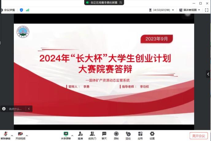 (通讯员白硕)9月27日下午2点半,我院通过腾讯会议的方式举行2024年“长大杯”大学生创业计划大赛院内选拔赛,高达、张方利和尚成三位老师担任评委,分团委书记郭霖老师参会。