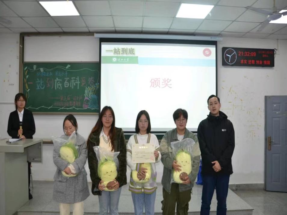 最终,来自“临时组队”的张冰瑶同学荣获“百科之王”称号;由喻乾虹、田诗雨、李泽涵、张冰瑶组成的“临时组队”获得本次大赛的一等奖;由队长罗帅杰带领的“广西老表护卫队”及队长巩鑫强带领的“工凡三金弓口虫”队获得本次大赛的二等奖;“啊对对队”、“我猜的都队”、“好想和你凑一队”获得本次比赛的三等奖;此外,李雨泽、王坤喆、史晓岩等12位同学获得优秀奖。