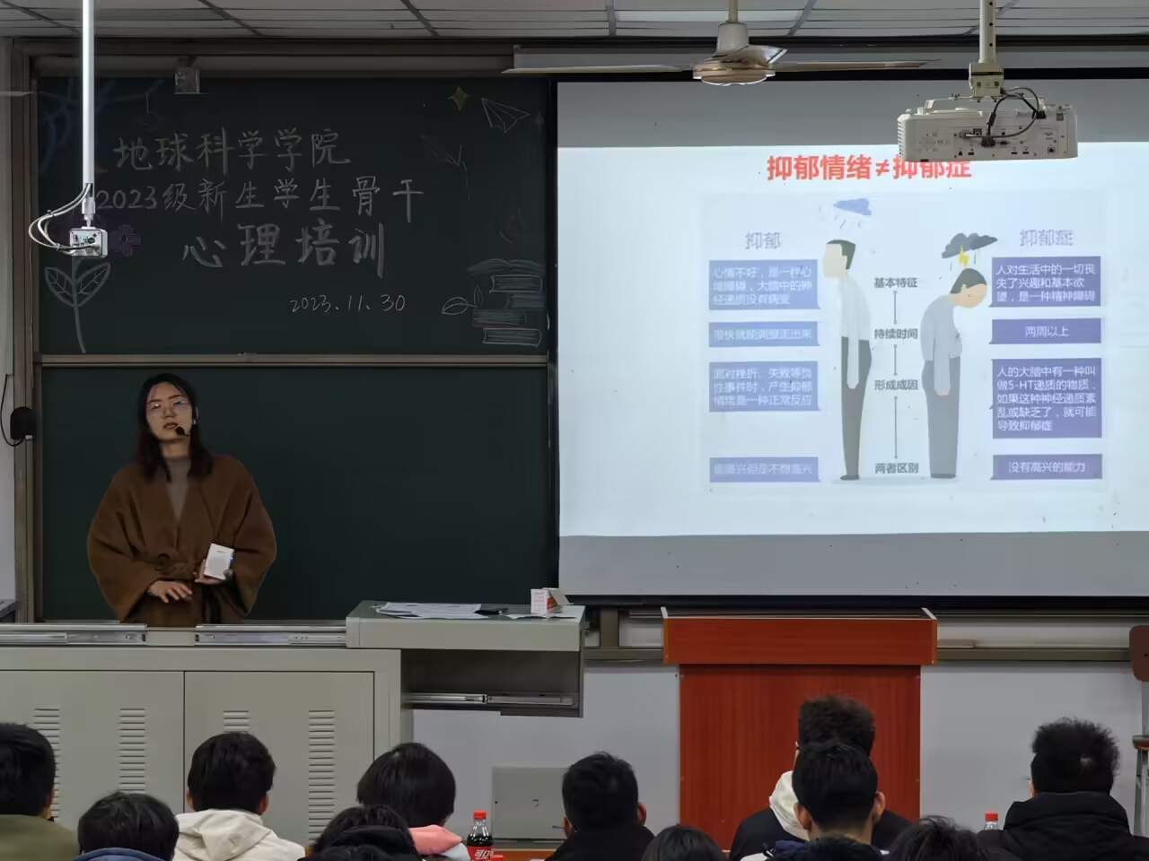 (通讯员:朱永康摄像:宁佳怡杜民意)11月30日14:00,我院全体23级新生学生骨干齐聚于武教B108,学习“大学生常见心理问题与应对”,心理专干王红桥老师担任主讲。
