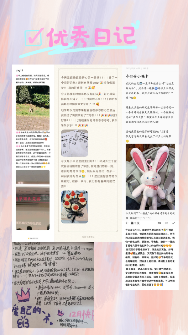 学生会心育部成员通过在活动前入班宣讲,吸引同学了解和参与。百余名同学每天通过QQ群的打卡链接,积极分享身边有爱的同伴、暖心的事物、感动的时刻。例如地信22302班文木燕同学在 11 月 28 日的感恩日记中写到“今天是小宋公主的生日!和另外三个室友偷偷给她准备了惊喜,在她进门的那一刻。看到她先是惊讶,然后眼眶微红,在那一瞬间我也好想哭,这就是惊喜的意义!”令人心里一暖。每晚心育部负责人提醒、完成收集后,会选出优秀日记,并于次日公布名单并制成电子海报分享在QQ群,鼓励同学们继续努力“晒幸福”。