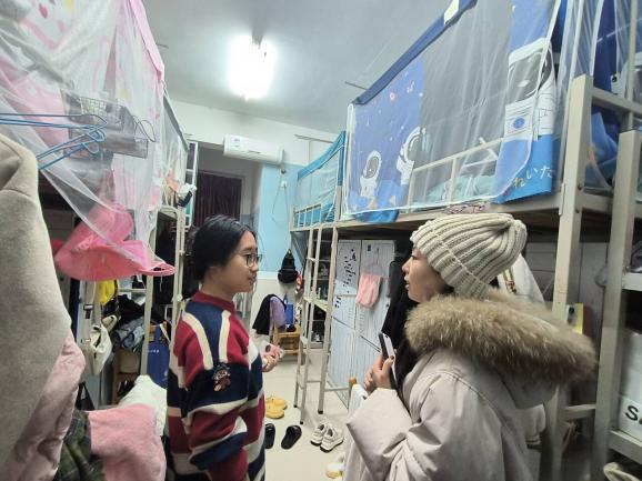 在走访过程中,老师们询问学生们的学习生活近况,特别关注大家在大学英语四六级、期末考试的备考情况及情绪状态。对于在班级中成绩落后的同学,老师们关切询问学生复习进度,鼓励学生保持良好心态,同时在宿舍开展考风考纪教育,以典型案例警示学生们切勿作弊,扎实做好诚信教育工作。对于即将迎接12月底研究生入学考试的2020级本科生,老师们积极开导大家:“在战术上重视敌人,战略上藐视敌人,放平心态,做好最后的冲刺,争取一战成硕。”