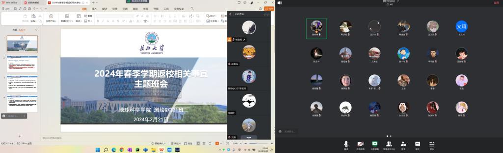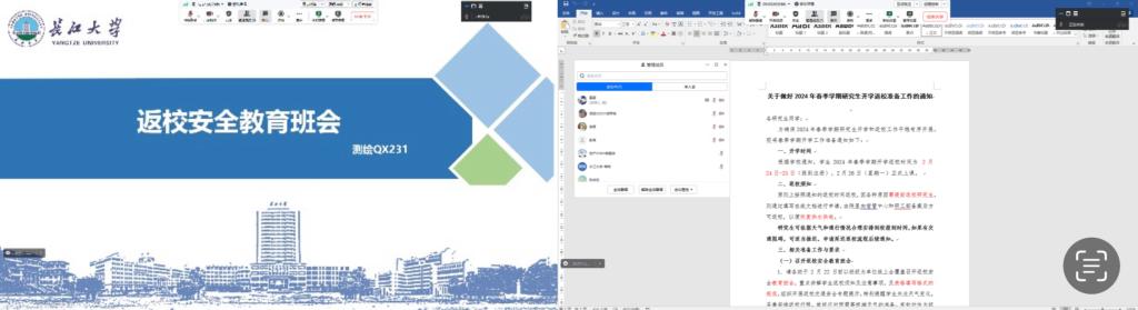 (通讯员 王少宁)武汉新一轮雨雪极端天气来袭,为确保学生平稳有序返校,我院学生事务办公室接到校党委学生工作部工作要求后,于2月20至22日组织全体研究生参加以班级为单位,通过腾讯会议等平台召开的2024年春季学期返校安全教育班会,会议由各班班长主持。