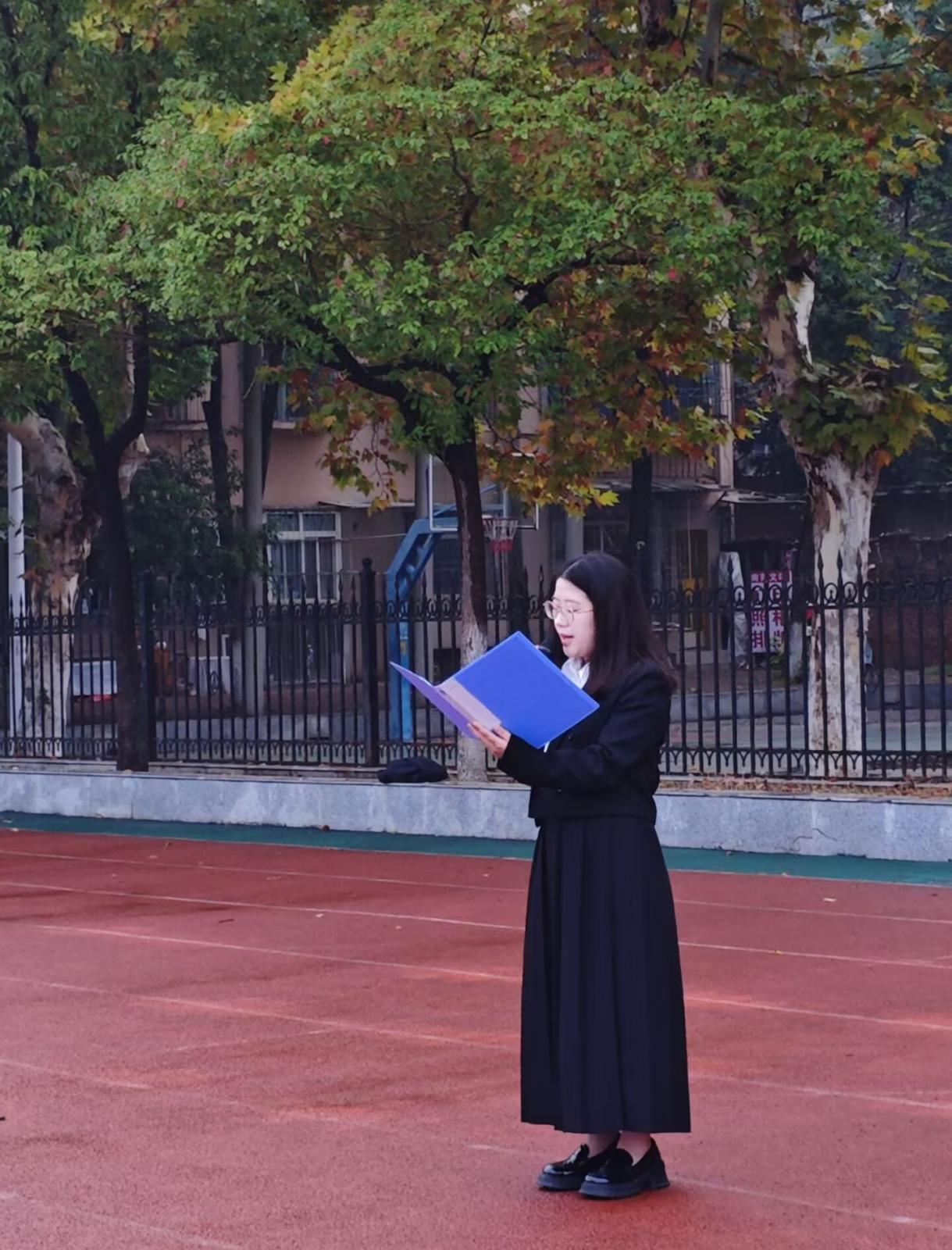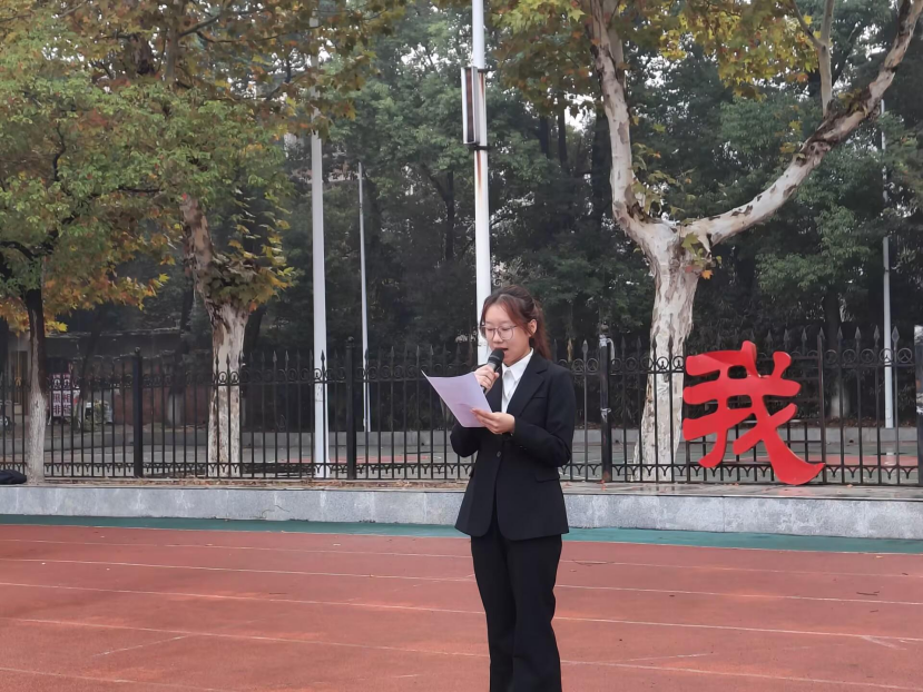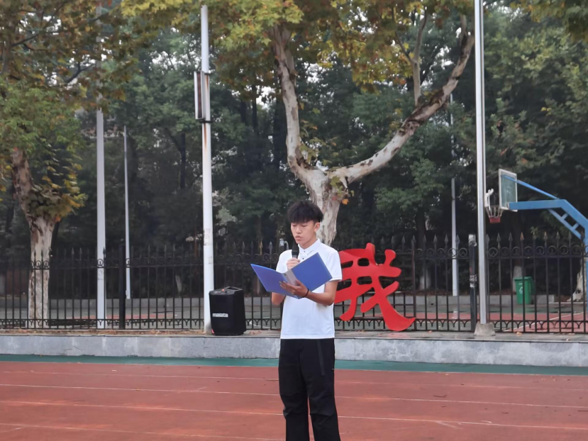 首先,大家列队整齐后,主持人张铭涵宣布升旗仪式开始,随着激昂的进行曲响起,国旗护卫队队员迈着整齐有力的步伐,护送着鲜艳的五星红旗走向升旗台。他们目光坚定,身姿挺拔,每一个动作都彰显着对国旗的敬重。在雄壮的国歌声中,五星红旗缓缓升起,全体师生面向国旗肃立,行注目礼,高唱国歌。那激昂的旋律在校园上空回荡,表达着师生们对祖国的无限热爱和忠诚。