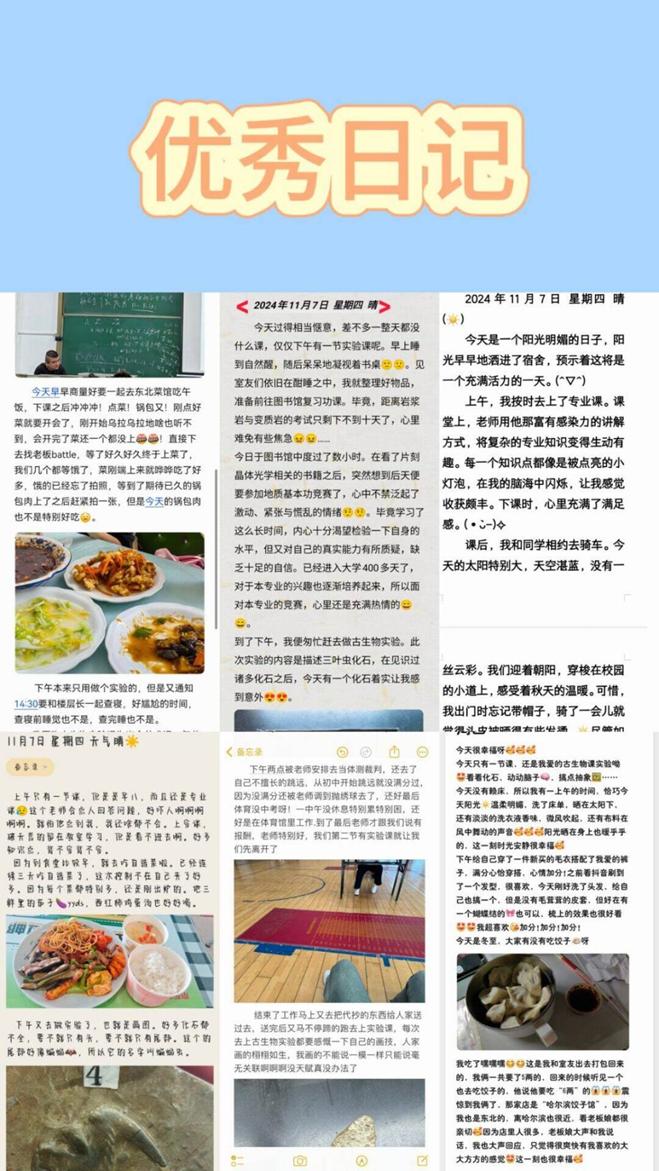 “路上,看到了特别美的日落”,“只要有心就可以跨越万难”,“图书馆四楼靠窗的风景,不就是一幅山水画嘛”,“听歌是一件很幸福很放松的事”,“今天有一个化石着实让我感到意外”,“每个知识点都像一个点亮的小灯泡,在我的脑海里闪烁,让我感觉收获颇丰,下课时,心里充满满足感”.......无论是他人的帮助、个人的成长,还是日常的美食、美景,亦或是课堂上的收获,充满生活气息的图片、渗透着温度的细腻文字、温馨瞬间......被同学们在感恩日记中一一捕捉。大家感恩生活中的每一份赠予,包括蓝天、白云、花草等大自然恩赐,以及遇到的困难和挑战,因为它们也是成长的一部分。