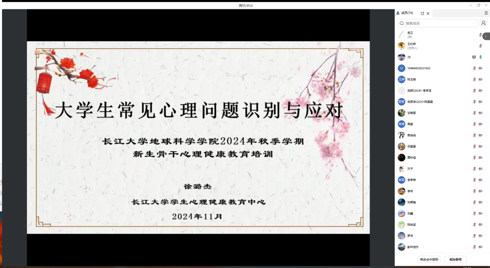 (通讯员 郭禹 审核 王红桥)2024年11月19日19:00,我院特邀心理健康中心徐潞杰老师主讲新生心理骨干教育培训,东校区135名本科生在12教104,武汉校区70名研究生心理骨干通过腾讯会议,共同参与学习。