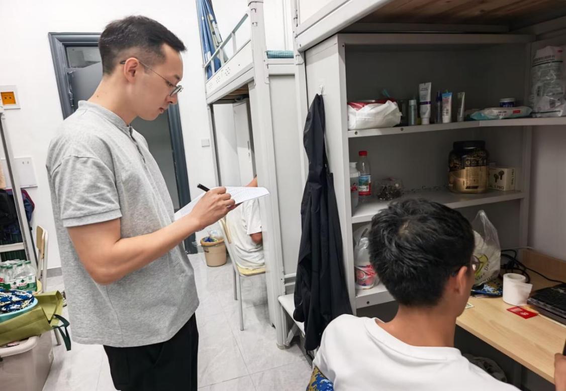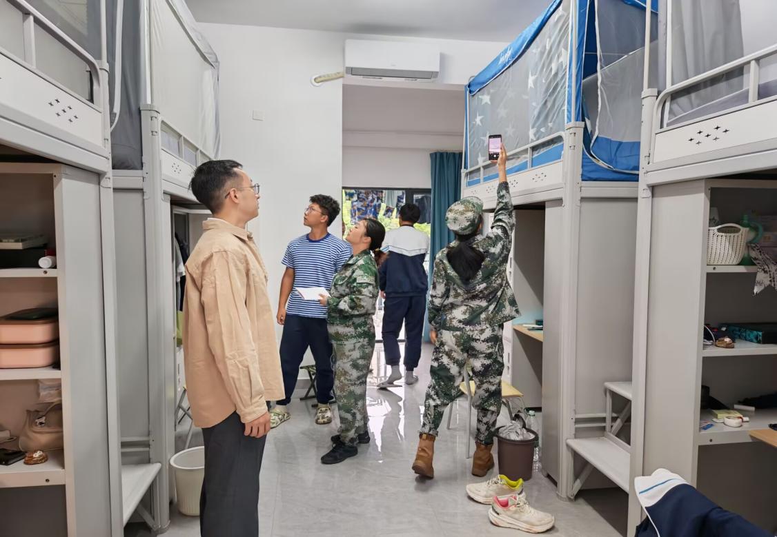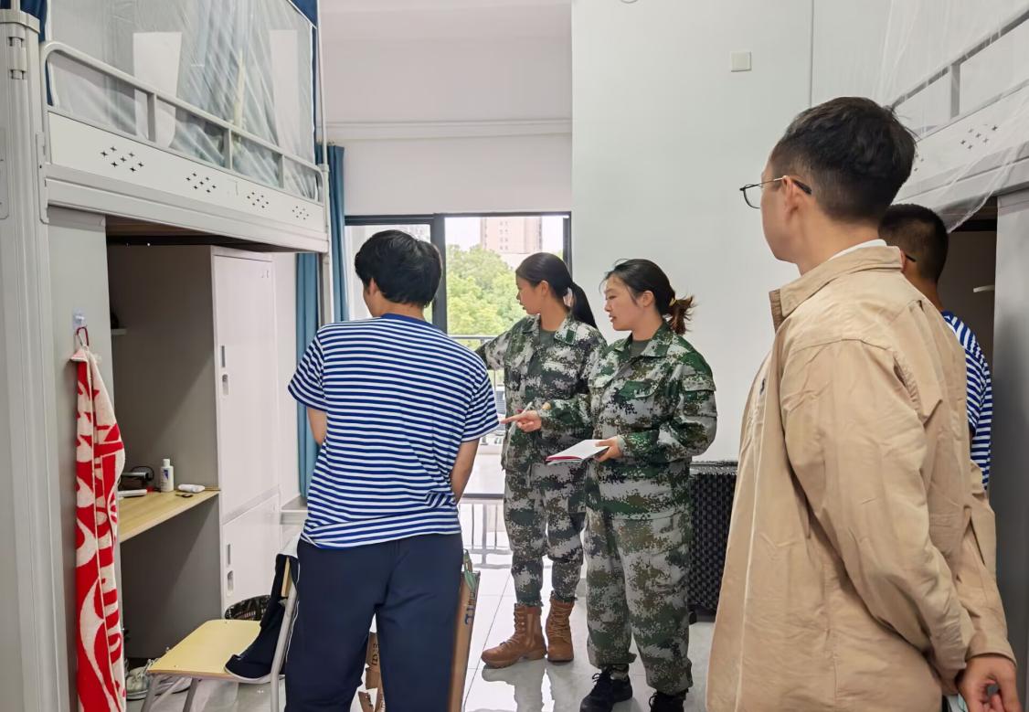 9月16日至18日,辅导员黄瑱、教官及兼职辅导员深入新生宿舍,对宿舍内务进行考评。教官们围绕床铺整理、物品摆放、公区卫生等环节对新生耐心指导、逐一查验并量化打分。黄老师检查住宿设施安全,关切询问军训适应情况,并就校园生活常见问题予以解答,叮嘱学生注意军训防护、及时反馈需求,鼓励学生互帮互助,营造温暖融洽的集体氛围。